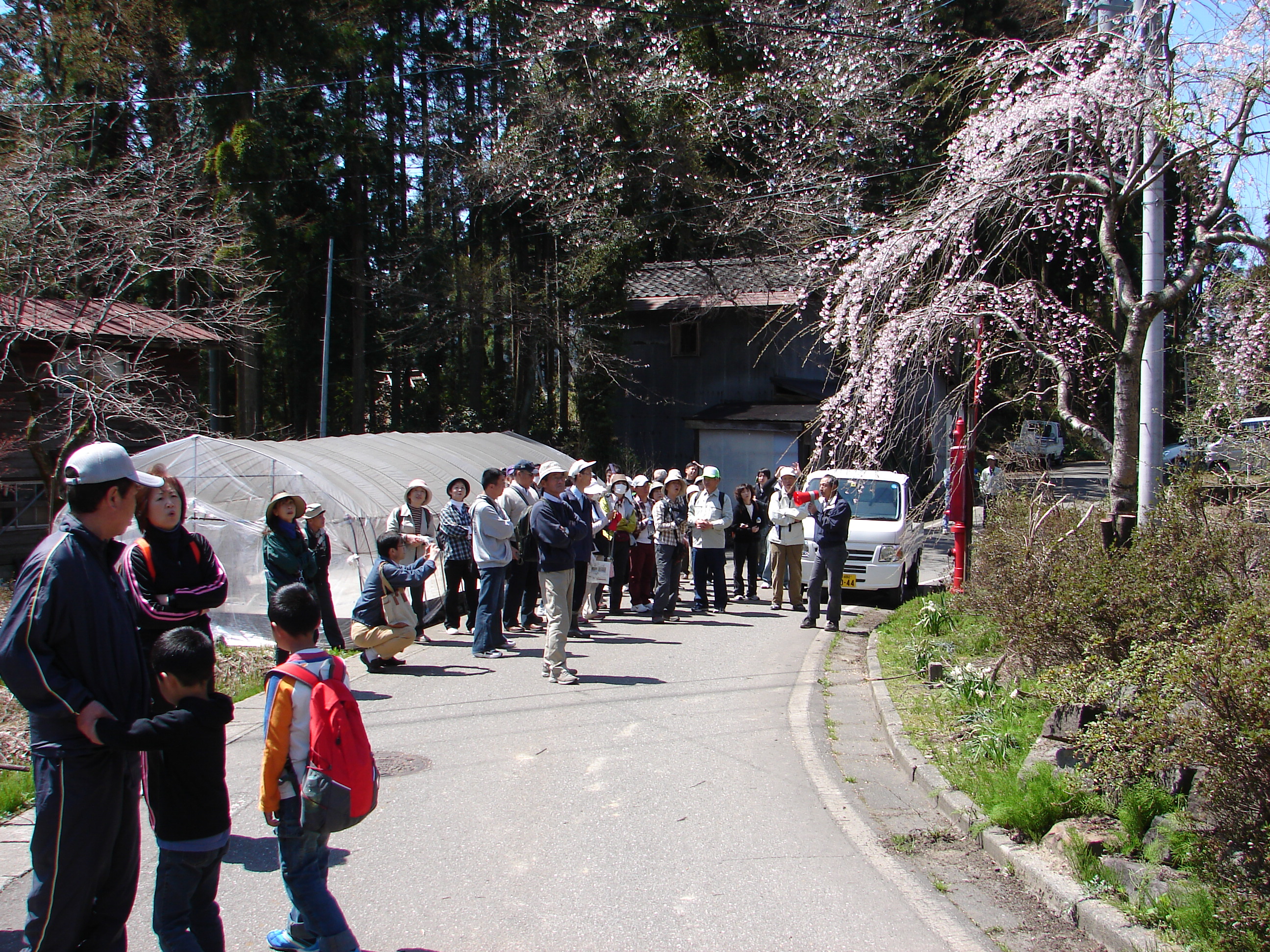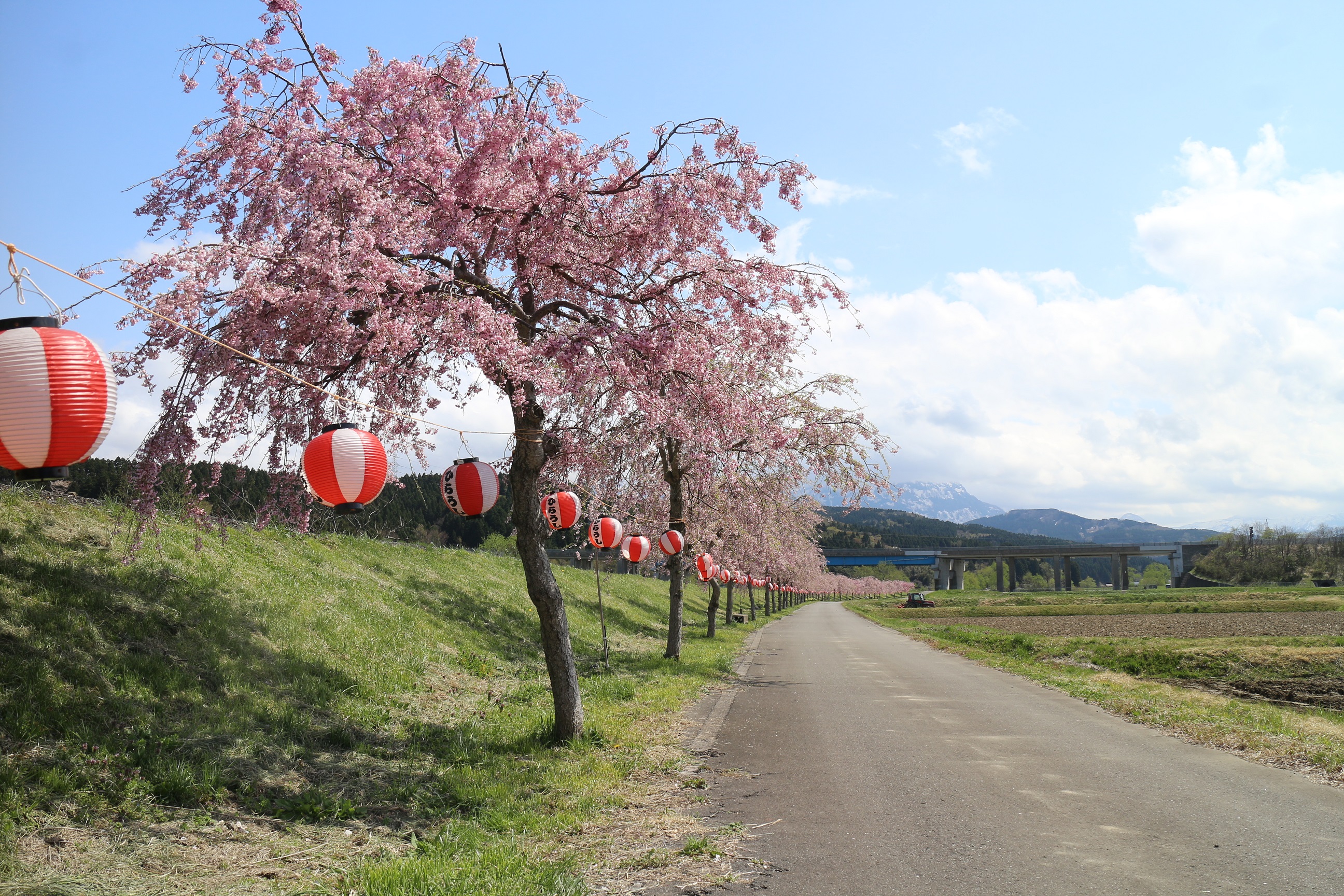 地元のみなさんが、地域おこしのために育てたシダレザクラ。道ばたを淡く彩る姿は、国土交通省「日本風景街道」に指定されています。