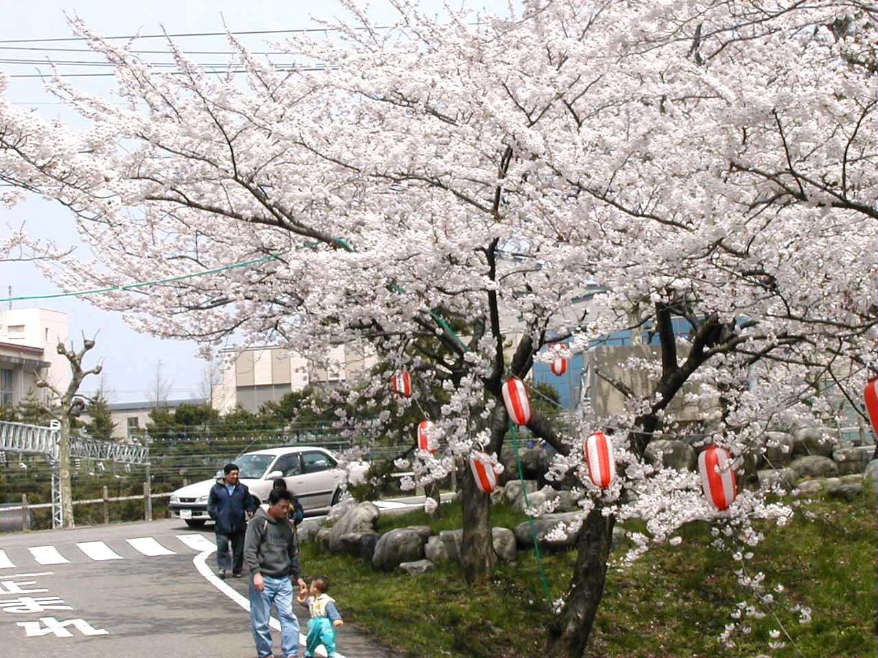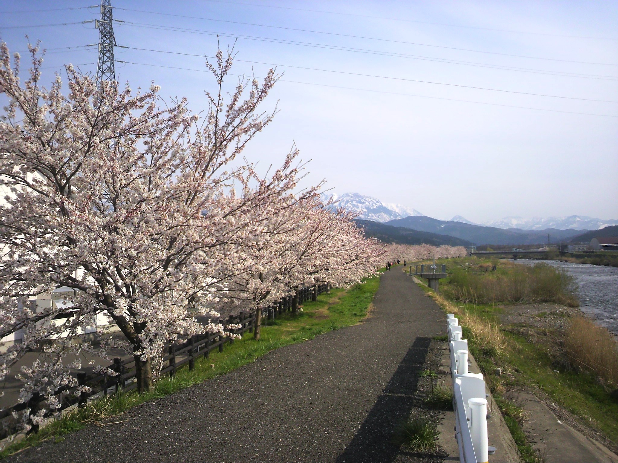市民も一緒になって植えた約500本の桜並木が、姫川の堤防を彩ります。距離があり、ウォーキングしながらの花見もさわやかです。